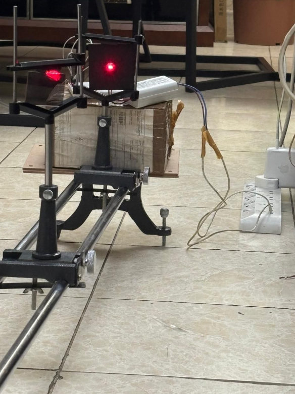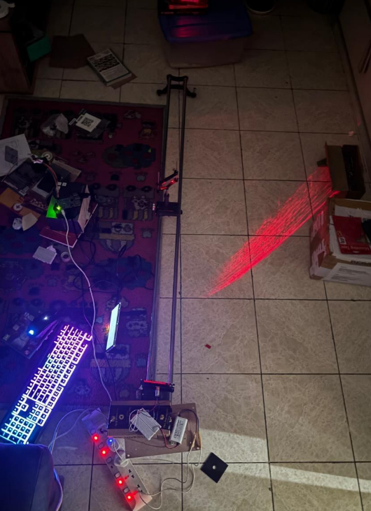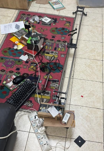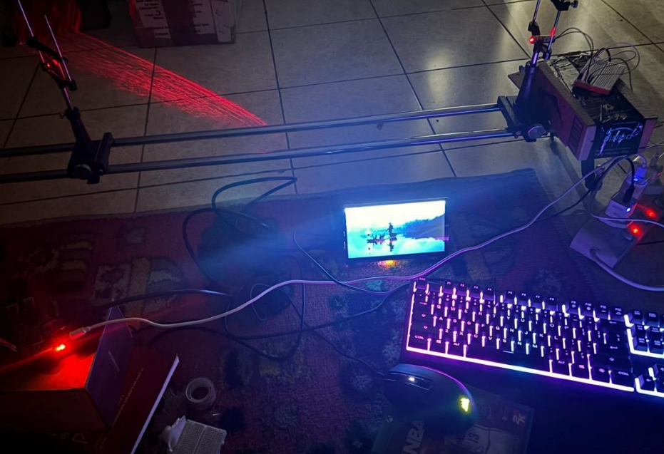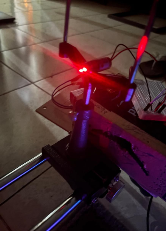 This is the setup of my Michelson Interferometer, there is a Raspberry Pi, screen, laser source, 50/50 beam splitter, 2 mirrors, 3d printed mounts to hold the beam splitter and the BH1750 Sensor